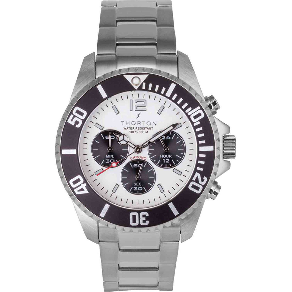 Ατσάλινος χρονογράφος κατασκευασμένος από την ΤΗΟRΤΟΝ. Η απεικόνιση της ώρας είναι αναλογική ενώ ταυτόχρονα μπορούμε να πληροφορηθούμε την 24 ωρη ώρα από τον δείκτη ο οποίος είναι τοποθετημένος στον κύκλο δίπλα από τη θέση 3 της πλάκας. Η δυνατότητα χρονομέτρησης προσεγγίζει τα 30 λεπτά και απεικονίζεται από τον δείκτη που υπάρχει στον κύκλο της θέσης 9 του καντράν. Τα δευτερόλεπτα της χρονομέτρησης απεικονίζονται από τον δείκτη που βρίσκεται στη θέση 6 της πλάκας.Περιμετρικά του κρυστάλλου έχει τοποθετηθεί περιστρεφόμενο στεφάνι χρονομέτρησης 60 λεπτών
