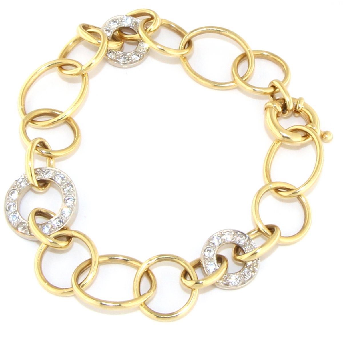 Βραχιόλι σε κίτρινο και λευκό χρυσό 14 καρατίων.Αποτελείται από κρίκους σε στρογγυλό και οβάλ σχήμα περασμένους ο ένας μέσα στον άλλο.Ανάμεσα τους παρεμβάλλονται τρείς στρογγυλοί κρίκοι λευκοί διακοσμημένοι με ζιρκόν.