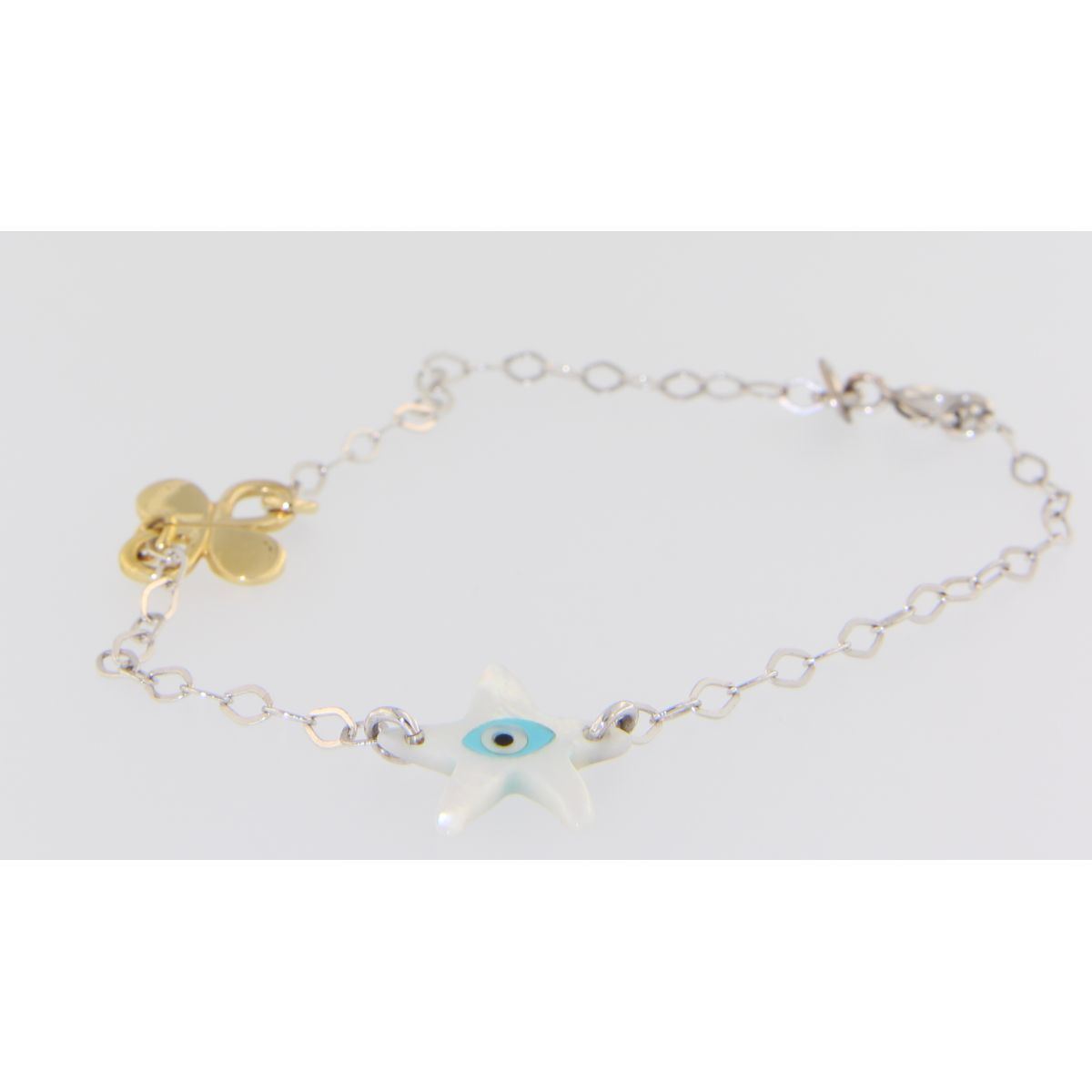Γυναικείο βραχιόλι σε συνδυασμό λευκού και κίτρινου χρυσού σε 14 καράτια.Αποτελείται από λουστρέ λευκόχρυση αλυσίδα στην οποία προσαρμόζεται σταυρός από κίτρινο λουστρέ χρυσό και ένα μοτίφ από λευκό φίλντισι με μάτι σε σχήμα αστέρι.