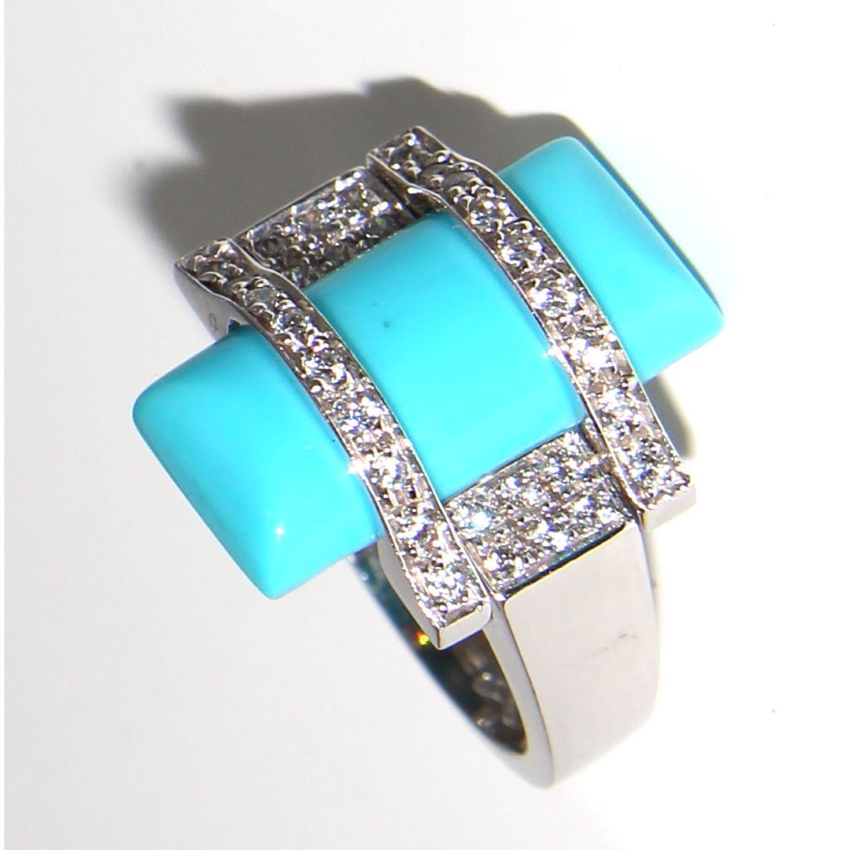 Γυναικείο δαχτυλίδι από λευκόχρυσο σε 14 καράτια με λουστρέ φινίρισμα.Στο κέντρο προσαρμόζεται πέτρα τυρκουάζ σε ορθογώνιο σχήμα η οποία διακοσμείται με λευκόχρυσο πλαίσο από ζιρκόν.