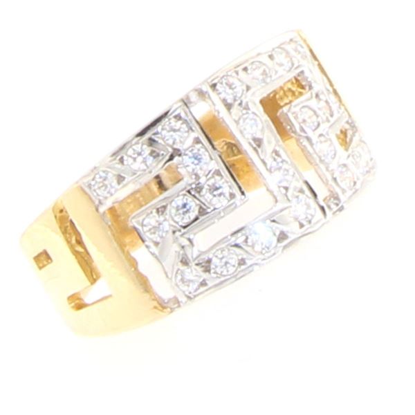 Γυναικείο δαχτυλίδι σε κίτρινο χρυσό 14 καρατίων με λευκές λεπτομέρειες.Η βάση του είναι κίτρινη λουστρέ και η επιφανειά του έχει σχήμα μαίανδρου το κέντρο του οποίου είναι από λευκόχρυσο διακοσμημένο με ζιρκόν.Το μεγεθός του προσαρμόζεται.