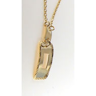Γυναικείο κολιέ από κίτρινο χρυσό σε 14 καράτια.Αποτεελίται από λεπτή αλυσίδα και ένα κεντρικό μοτίφ σε σχήμα τετράγωνο διαμανταρισμένο περιμετρικά.Σε απόσταση 5 εκατοστών από το κέντρο και στις δύο πλευρές της αλυσίδας παρεμβάλονται δύο μικρά τετράγωνα μοτίφ