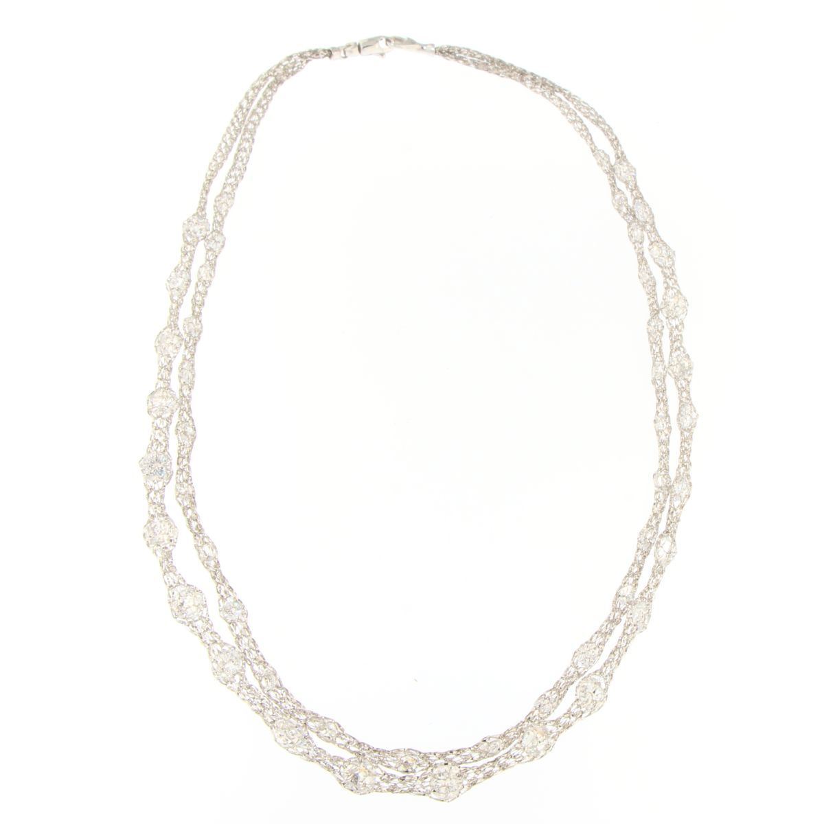 Κολιέ σε λευκόχρυσο 14 καρατίων.Αποτελείται από δύο σειρές αλυσίδων με σχήμα λεπτό δίχτυ οι οποίες ενώνονται στα άκρα τους.Η εσωτερική αλυσίδα έχει μήκος 43 εκατοστά και η εξωτερική 44,5 εκατοστά.Μέσα στις αλυσίδες είναι περασμένα ζιρκόν σε απόσταση ενός εκατοστού το ένα απο το άλλο.Οι πέτρες της εσωτερικής αλυσίδας είναι μικρότερου μεγέθους.