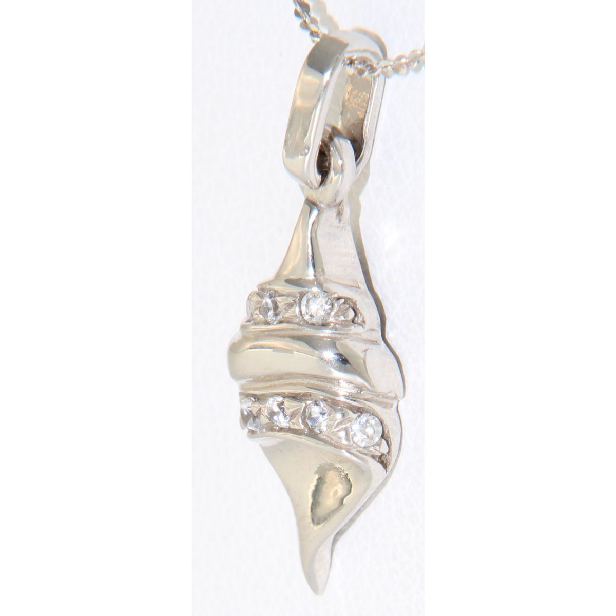 Μενταγιόν από λευκόχρυσο 14 καρατίων. Αποτελείται από μοτίφ με λουστρέ επιφάνεια στην οποία σχηματίζονται τρεις καμπύλες λωρίδες.Οι δύο λωρίδες διακοσμούνται με ζιρκόν αφήνοντας αναμεσά τους μία λωρίδα λουστρέ.