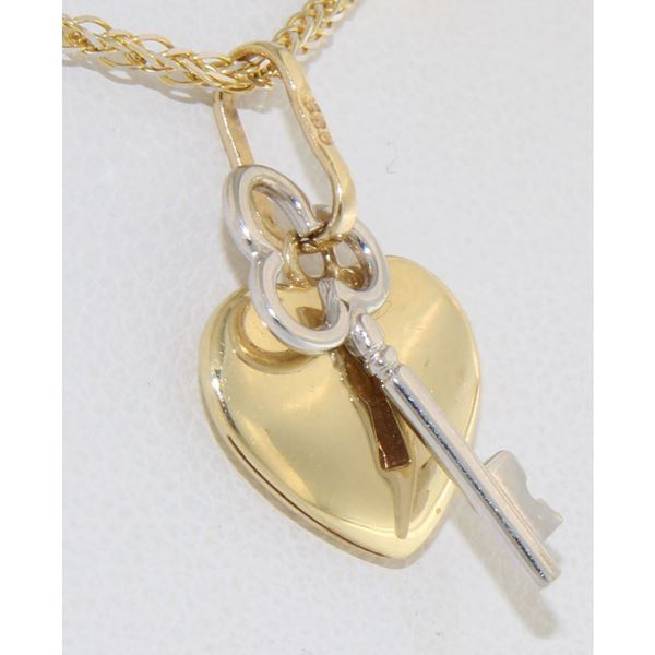 Μενταγιόν σε συνδυασμό κίτρινου και λευκού χρυσού 14 καρατίων. Αποτελείται από δύο μοτίφ που κρέμονται από τον ίδιο κρίκο .Το ένα από λουστρέ λευκόχρυσο παριστά ένα κλειδί.Το δεύτερο από κίτρινο λουστρέ χρυσό παριστά λουκέτο σε σχήμα καρδιάς.