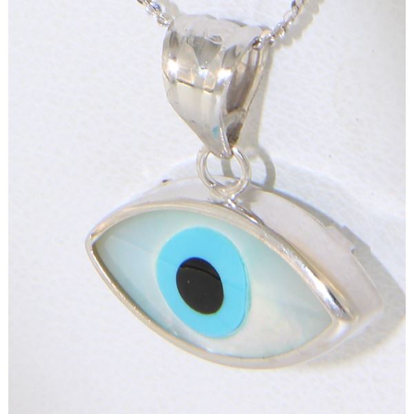 Μενταγιόν (μάτι) από λευκόχρυσο 14 καρατίων.Αποτελείται από λουστρέ πλαίσο στο οποίο περικλείεται φίλντισι