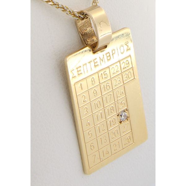 Πλάκα από κίτρινο λουστρέ χρυσό σε 14 καράτια.Στη μία όψη της επιφάνειας της χαράσεται το ημερολόγιο κάθε μήνα.Μία μικρή πέτρα ζιρκόν στερεώνεται στην επιθυμητή ημεομηνία.Τα προϊόντα τα οποία χαράσσονται δεν επιστρέφονται