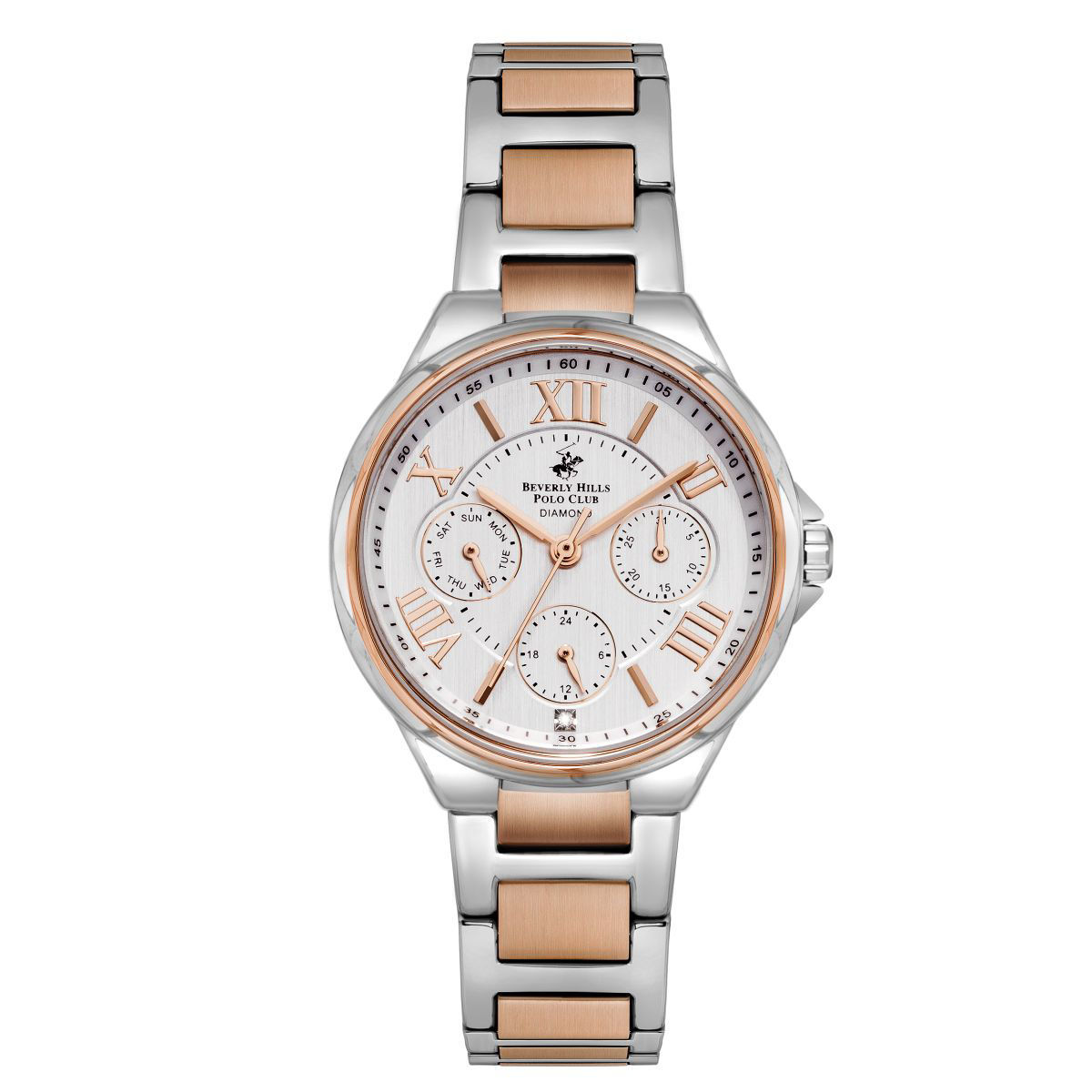 Γυναικείο ρολοί κατασκευασμένο από την BEVERLY HILLS POLO CLUB σε δίχρωμο ανοξείδωτο ατσάλι με λευκό καντράν το οποίο στη θέση 6 διακοσμείται με ένα φυσικό διαμάντι ενώ τα νούμερα μαζί με τους δείκτες έχουν χρώμα ροζ.Το ρολόι είναι εξοπλισμένο με μηχανισμό πολλαπλών ενδείξεων από τον οποίο αντλούμε τις εξής πληροφορίες : 1) την ημέρα (ο κύκλος που βρίσκεται στη θέση 9 του καντράν) 2) την ημερομηνία (ο κύκλος που βρίσκεται στη θέση 3 του καντράν) 3) 24ωρη ώρα (στον κύκλο που βρίσκεται στη θέση 6 του καντράν.Η απεικόνιση της ώρας είναι ανλογική με κεντρικό δευτερόλεπτο.