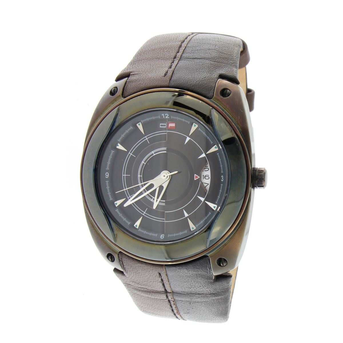 Ρολόϊ χειρός κατασκευασμένο από την DE FACTORY σε μέταλλο με ατσάλινο καπάκι και δερμάτινο δέσιμο.Η ώρα απεικονίζεται αναλογικά και η τρέχουσα ημερομηνία από το παράθυρο στη θέση 3 του καντράν