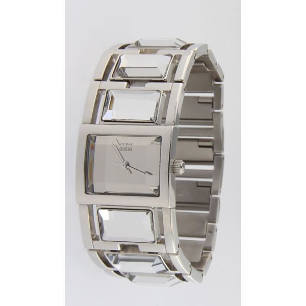 Γυναικείο ρολόϊ χειρός κατασκευασμένο από την GUESS σε ανοξείδωτο ατσάλι .Η απεικόνιση της ώρας γίνεται αναλογικά. Οι πέτρες που βρίσκονται πάνω στα τρία πρώτα κομμάτια του μπρασελέ έιναι γυαλί ενισχυμένο με μόλυβδο