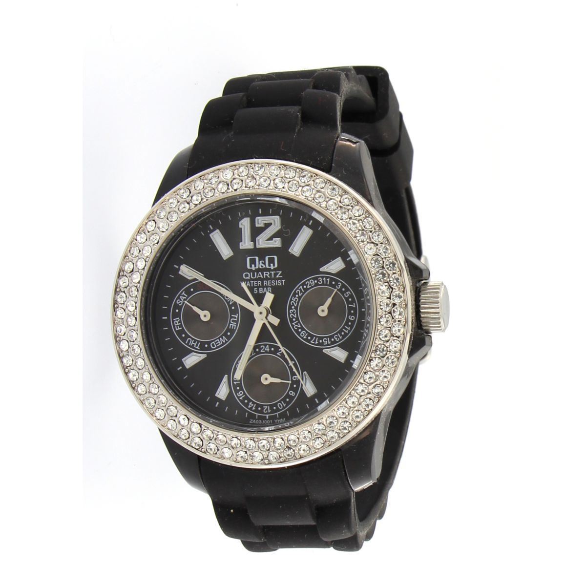 Ρολόϊ χειρός γυναικείο κατασκευασμένο από την Q&Q σε κεραμική κάσα με πλαστικό δέσιμο.Η απεικόνιση της ώρας είναι αναλογική .Ο δείκτης στον κύκλο της θέσης 9 απεικονίζει τις ημέρες της εβδομάδας .Την τρέχουσα ημερομηνία την βλέπουμε από τον δείκτη στον κύκλο της θέσης 3.Ο δείκτης στον κύκλο της θέσης 6 απεικονίζει την 24ωρη ώρα.Οι πέτρες που βρίσκονται περιμετρικά του κρυστάλλου είναι ζιρκόν.