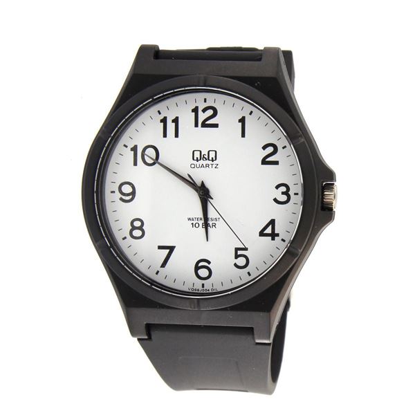 Ρολόϊ χειρός unisex κατασκευασμένο από την Q&Q σε πλαστική κάσα με καπάκι από ανοξείδωτο ατσάλι και πλαστικό δέσιμο.Η ώρα απεικονίζεται αναλογικά.
