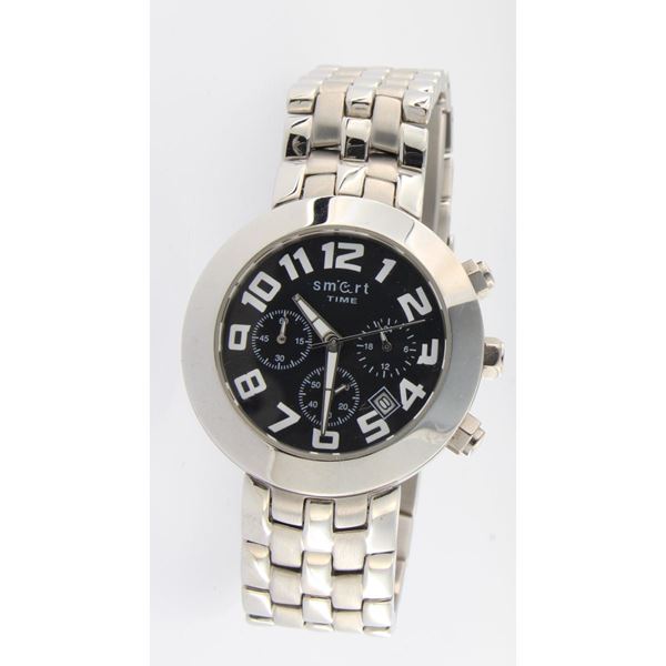 Ρολόϊ χειρός unisex κατασκευασμένο από την SMART σε ανοξείδωτο ατσάλι .Η απεικόνιση της ώρας είναι αναλογική με τον δευτερολεπτοδείκτη να βρίσκεται στον κύκλο της θέσης 6.Ο χρονογράφος έχει δυνατότητα μέτρησης 60 λεπτών με τον λεπτοδείκτη να βρίσκεται στον κύκλο της θέσης 9.Η 24ωρη ώρα βρίσκεται στη θέση 3.Η τρέχουσα ημερομηνία είναι ορατή από το παράθυρο στη θέση 4:30.