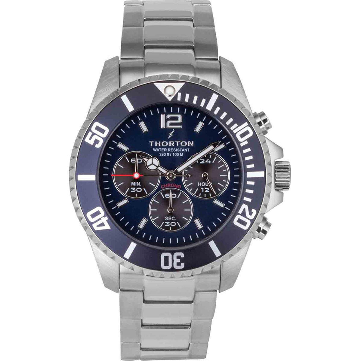 Ατσάλινος χρονογράφος κατασκευασμένος από την ΤΗΟRΤΟΝ. Η απεικόνιση της ώρας είναι αναλογική ενώ ταυτόχρονα μπορούμε να πληροφορηθούμε την 24 ωρη ώρα από τον δείκτη ο οποίος είναι τοποθετημένος στον κύκλο δίπλα από τη θέση 3 της πλάκας. Η δυνατότητα χρονομέτρησης προσεγγίζει τα 30 λεπτά και απεικονίζεται από τον δείκτη που υπάρχει στον κύκλο της θέσης 9 του καντράν. Τα δευτερόλεπτα της χρονομέτρησης απεικονίζονται από τον δείκτη που βρίσκεται στη θέση 6 της πλάκας.Περιμετρικά του κρυστάλλου έχει τοποθετηθεί περιστρεφόμενο στεφάνι χρονομέτρησης 60 λεπτών