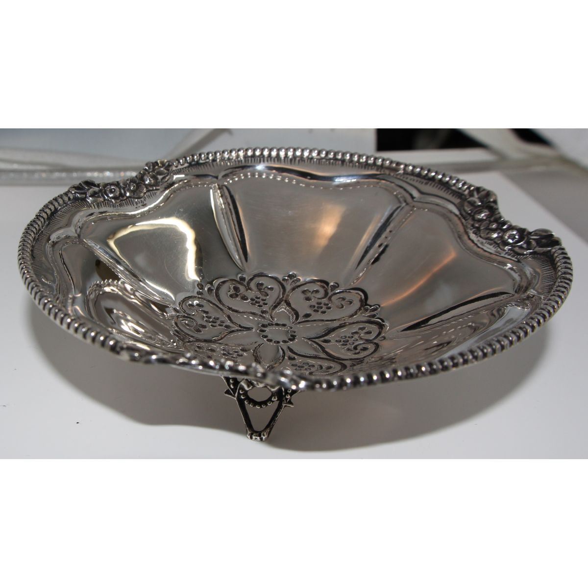 Σκεύος από ασήμι 925 βαθμών με κυκλικό σχήμα.Η επιφάνεια του είναι λεία-λουστρέ.Διακοσμείται στο εσωτερικά του και περιμετρικά με ανάγλυφα σχέδια.Το συγκεκριμένο προϊόν είναι διαθέσιμο κατόπιν παραγγελίας