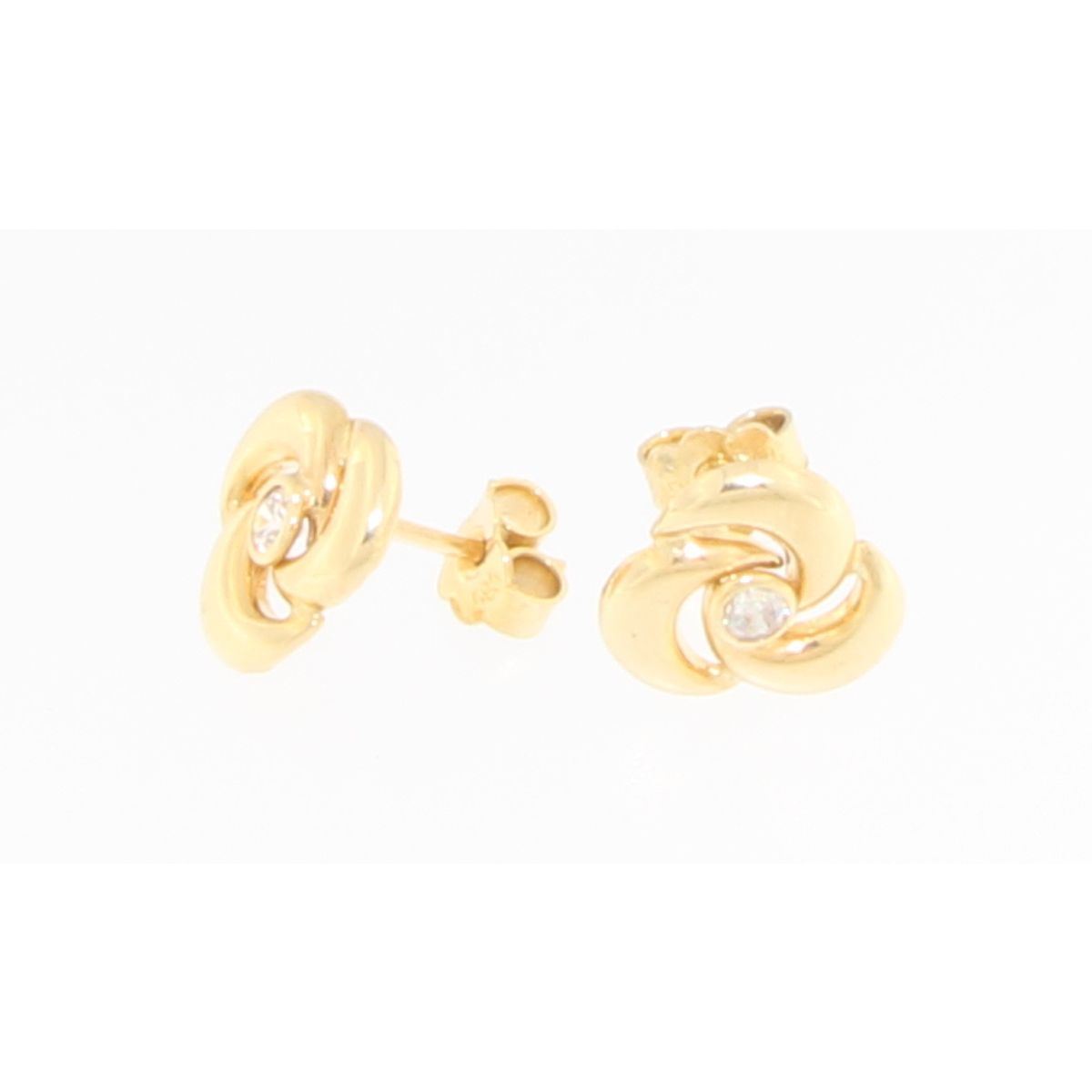 Σκουλαρίκια καρφωτά σε κίτρινο χρυσό 14 καρατίων.Αποτελούνται απο τρία κομμάτια σε σχήμα μισοφέγγαρου που ενώνονται μεταξύ τους κυκλικά και διακοσμούνται με ζιρκόν στο κέντρο.