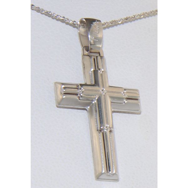 Σταυρός ανδρικός σε λευκό χρυσο 14 καρατίων.Η επιφανειά του είναι ματ με λουστρέ κρίκο.Πάνω στην επιφάνεια προσαρμόζεται ένας λεπτός σταυρός λουστρέ και πάνω σε αυτόν ένας μικρότερος σταυρός επίσης λουστρέ