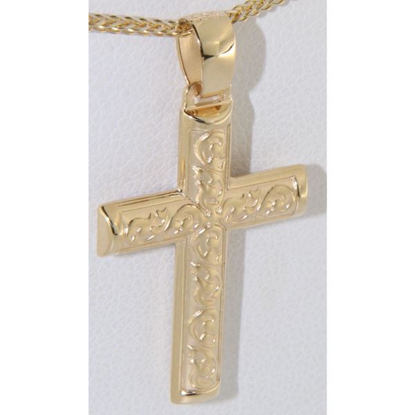 Σταυρός ανδρικός (βαπτιστικός) σε συνδυασμό κίτρινου και λευκού χρυσού 14 καρατίων διπλής όψεως.Η μία όψη είναι από κίτρινο λουστρέ χρυσό και πάνω της προσαρμόζεται μικρότερος σταυρός από λουστρέ λευκόχρυσο.Η δεύτερη όψη είναι μάτ με ανάγλυφο σχέδιο και λουστρέ φινίρισμα στα τέσσερα άκρα.