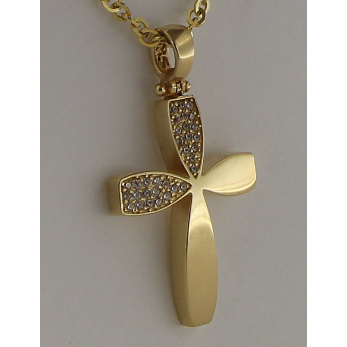 Γυναικείος σταυρός από κίτρινο χρυσό σε 14 καράτια με λουστρέ επιφάνεια.Μπορεί να φορεθεί και από τις δύο όψεις Η μία όψη διακοσμείται με πέτρες ζιρκόν