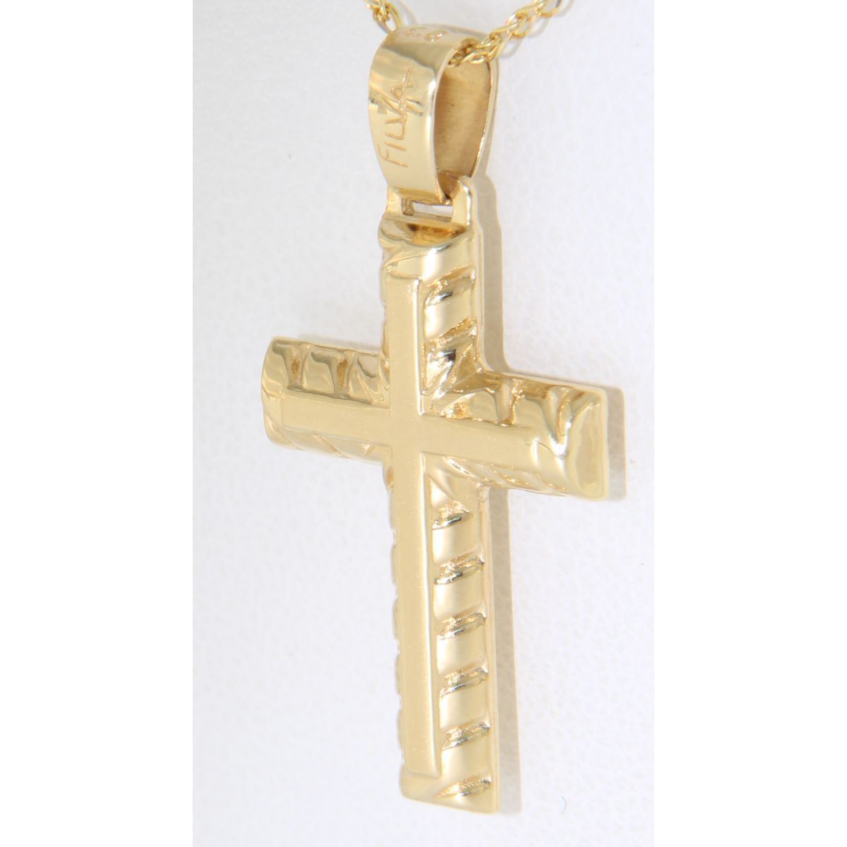 Σταυρός βαπτιστικός για αγόρι σε κίτρινο χρυσό 14 καρατίων.Η επιφάνεια του περιμετρικά είναι λουστρέ με ραβδώσεις και στο μέσο είναι ματ .Ο κρίκος είναι λουστρέ,