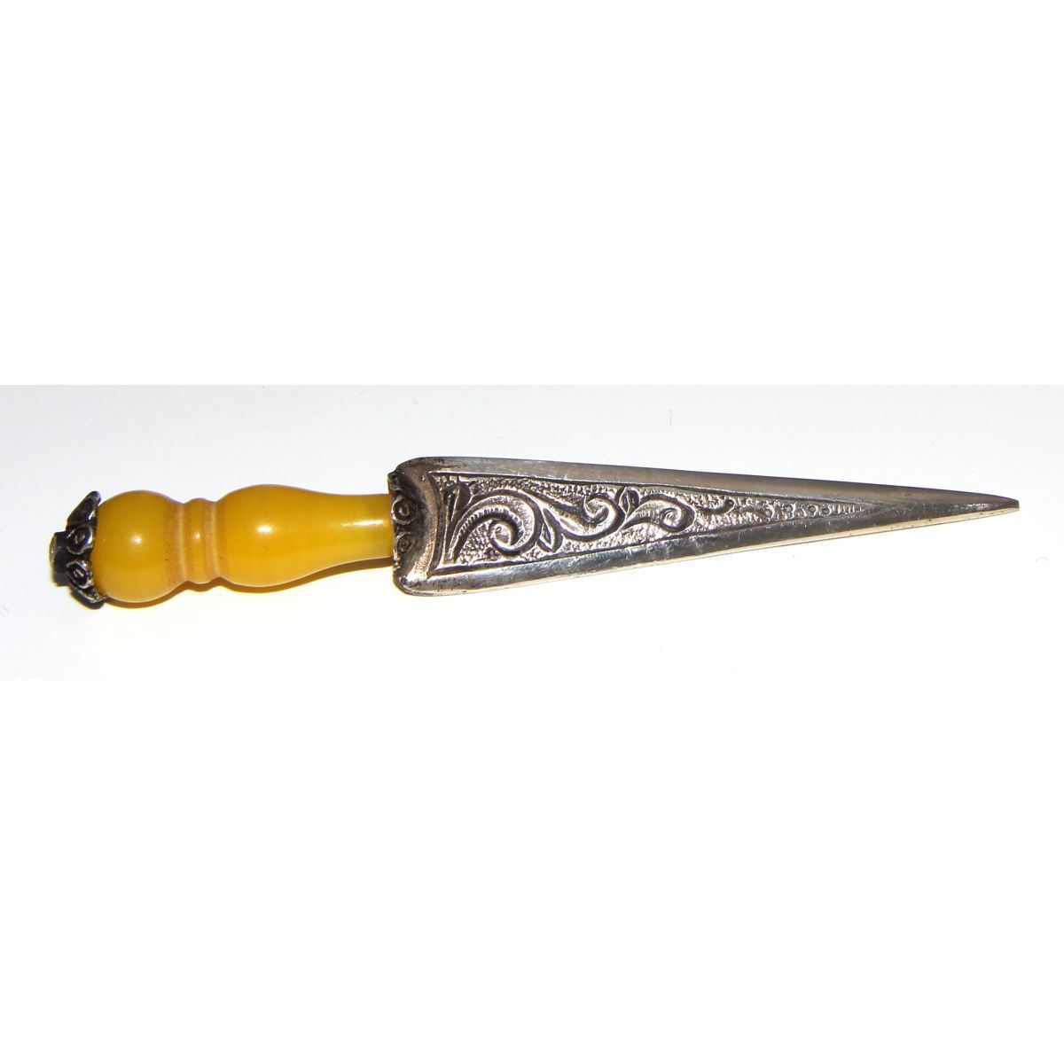 Χαρτοκόπτης από ασήμι 800 βαθμών.Η επιφανειά του κόπτη έχει ανάγλυφο σκάλισμα και στις δύο όψεις.Η λαβή αποτελείται από συνθετική πέτρα σε χρώμα κίτρινο.