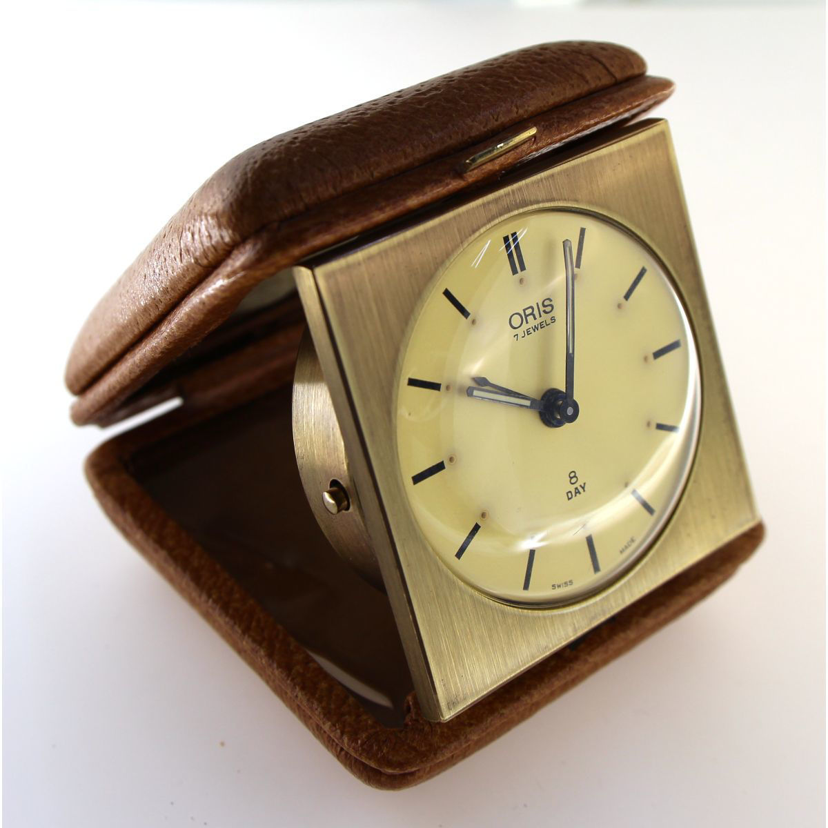 Συλλεκτικό κουρδιστό ξυπνητήρι ταξιδιού κατασκευασμένο από την ORIS σε μπρούτζινο πλαίσιο το οποίο στηρίζεται σε ατσάλινη θήκη επενδυμένη από δέρμα σε καφέ χρώμα. Η απεικόνιση της ώρας είναι αναλογική. Πλήρως κουρδισμένος ο μηχανισμός του αποδίδει 8 ημέρες συνεχούς λειτουργίας. Το κουμπί στα αριστερά της κυκλικής βάσης ακριβώς δίπλα από την θέση 9 της πλάκας απενεργοποιεί την λειτουργία της αφύπνισης. Το συγκεκριμένο μοντέλο δεν παράγεται πλέον και είναι προϊόν της δεκαετίας του 1960 μέρος ενός πολύ περιορισμένου σε αριθμό αποθέματος σε εξαιρετική κατάσταση με την εργοστασιακή του συσκευασία (η οποία λόγω της πολύχρονης αποθήκευσης στο κατάστημά μας έχει ελάχιστες φθορές)